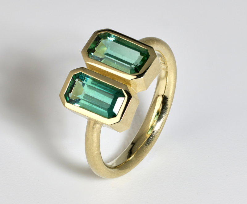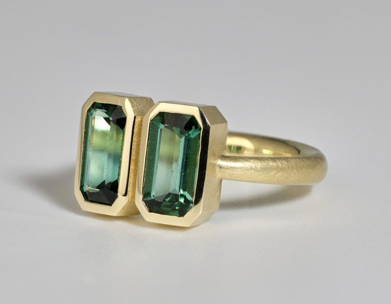 Geelgouden ring gemaakt in ons eigen atelier. De 2 indentiek geslepen toermalijnen zijn van bijzonder mooie kwaliteit, en gelijk van kleur. De ring heeft maat 17 wilt u meer weten over deze ring laat het ons gerust weten.