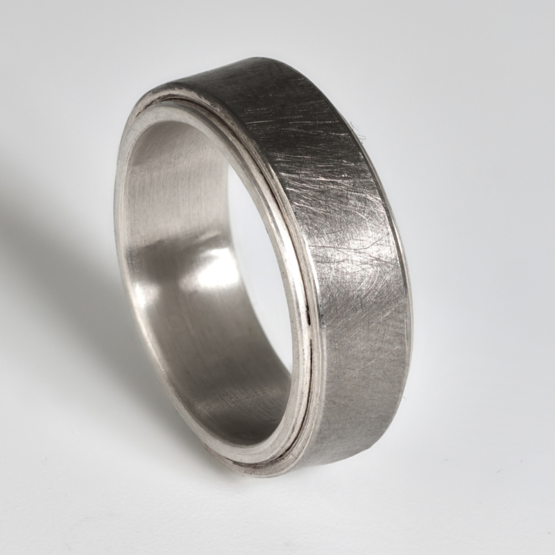 Zilveren ring met een palladium buitenlaag. De ring heeft maat 19 en is 7 mm breed. Door het robuuste ontwerp is deze ring zeer geschikt als stoere trouwring.