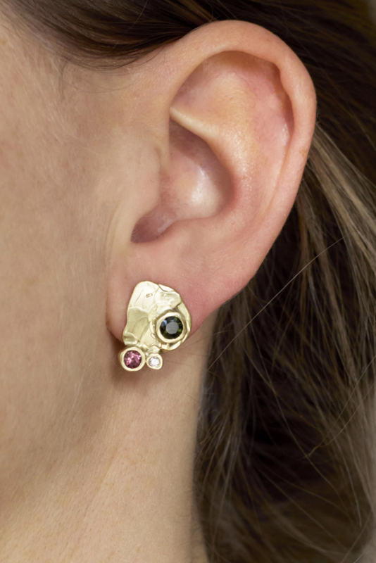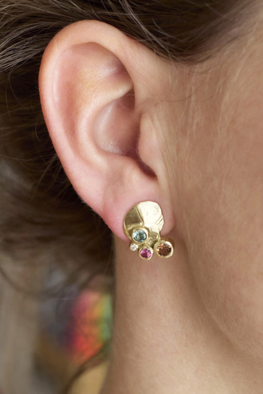 Geelgouden oorknopjes, met de hand vervaardigd in ons eigen atelier. Deze oorbellen uit de dripping art serie hebben een doorsnede van 15 mm en vallen op door de speelse combinatie van verschillende toermalijnen, die samen een levendig kleurenspel vormen. Twee kleine diamantjes geven een subtiele fonkeling. De matte afwerking van het goud zorgt voor een stijlvolle en eigentijdse uitstraling.