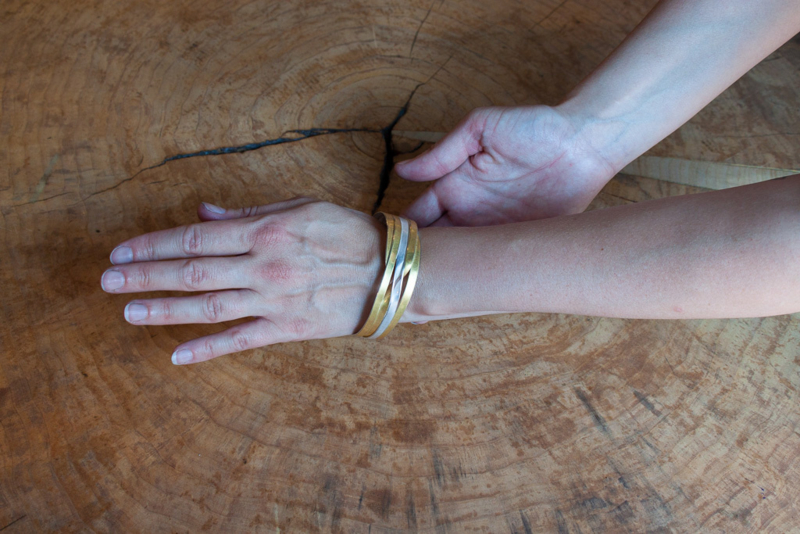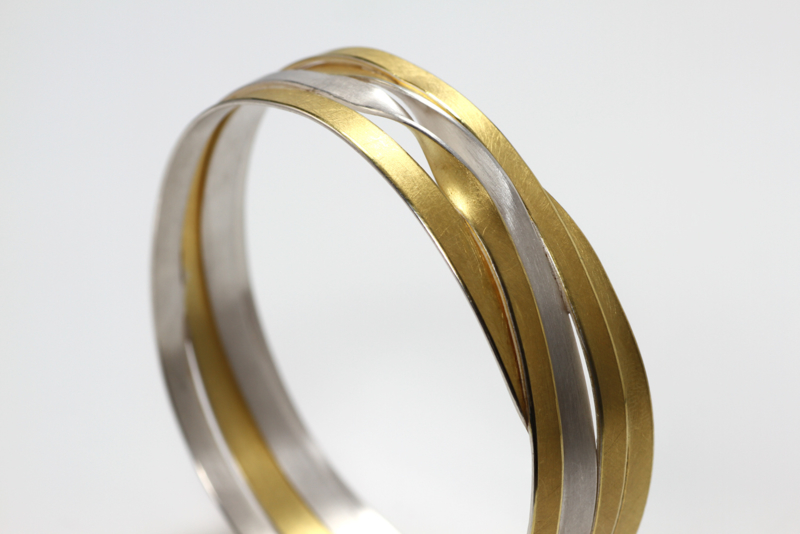 Zilveren armband met gouden details, gemaakt door Ute Strothotte. Deze tweekleurige armband is gemaakt van zilver en 22 karaat geelgoud. De armband heeft een breedte van 15 tot 20 mm. De maat van de armband is 70 mm een gemiddelde tot iets grotere polsmaat.