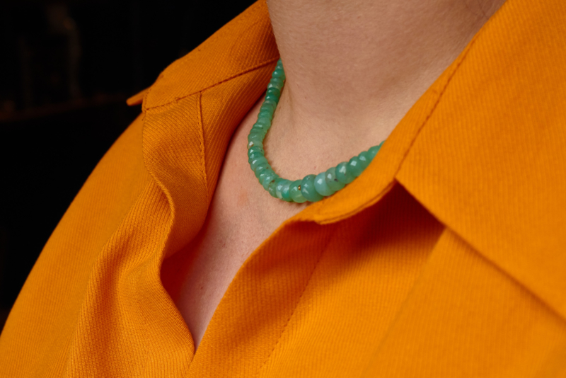 Mineraal ketting met gouden slot. Deze mooie ketting bestaat uit chrysopraas stenen van verschillende groottes; de grootste steen heeft een doorsnede van 10 mm..