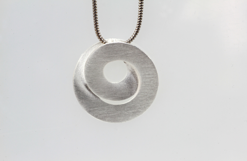 Een mat zilveren hanger. De hanger is plat en ruimtelijk tegelijk. De doorsnede is 2 cm. De ketting is niet bij de prijs inbegrepen maar mail me gerust om ernaar te vragen, info@gold-line.nl