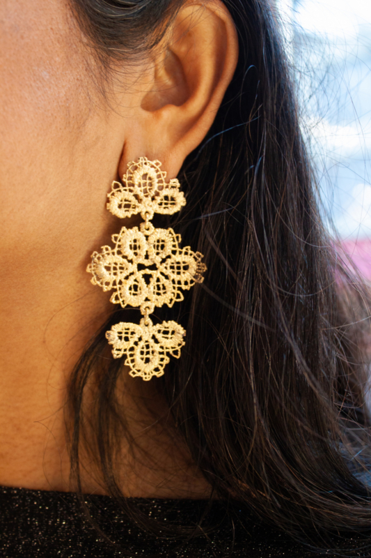 Vergulde oorbellen van Brigitte Adolph. De oorbellen zijn gemaakt van massief zilver, maar hebben een zachte uitstraling dankzij het kantwerk patroon.