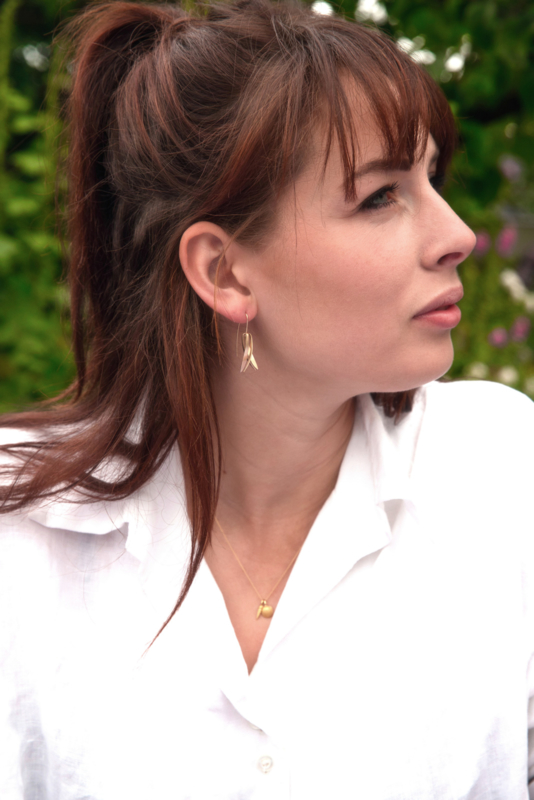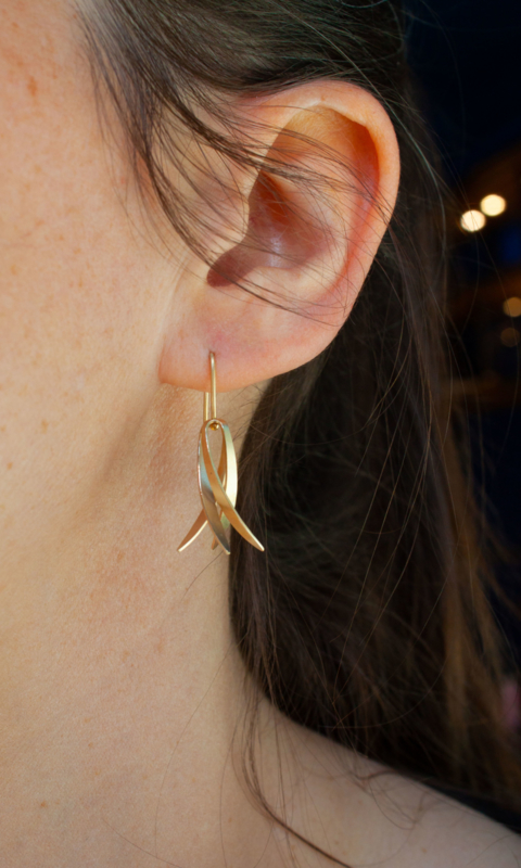 Mat geel gouden oorbellen gemaakt door Vincent van Hees. Sierlijke bewegelijke oorbellen zeer decoratief en elegant.