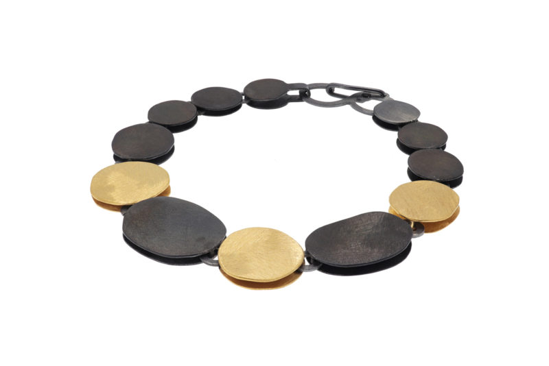 Zilveren schakel armband uit Polen. De schakels bestaan uit 2 plaatjes, deze zijn wisselend verguld of gebeitst. De ovale plaatjes liggen op elkaar met tussen ruimte. De armband ligt plat op de pols en heeft een stevige klip sluiting zodat de armband goed gesloten om de pols blijft zitten!