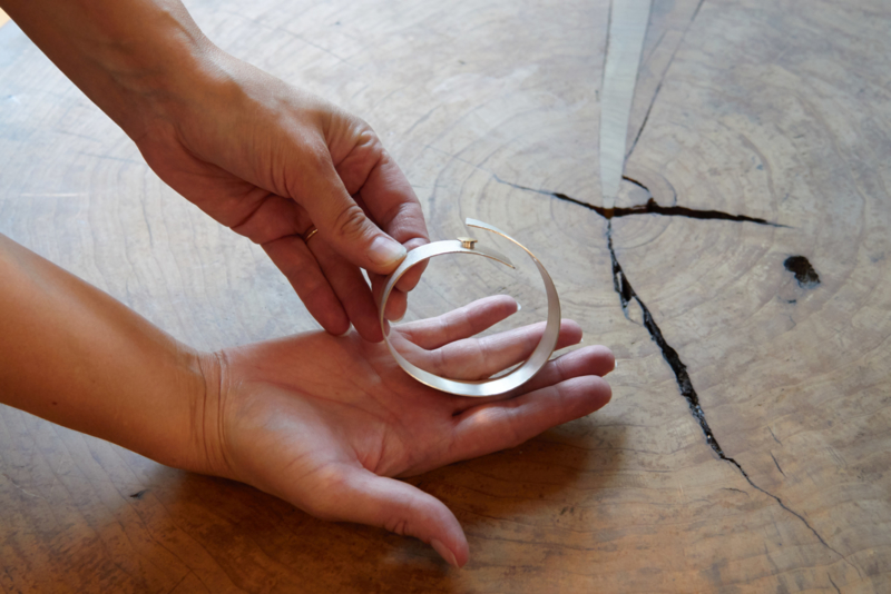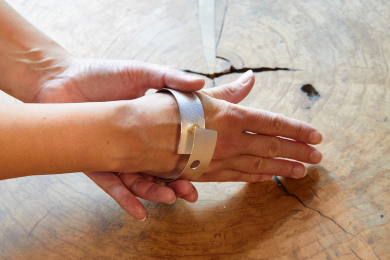 Zilveren armband met gouden detail, gemaakt door Manu uit Duitsland. De armband heeft een matte afwerking en kan eenvoudig geopend en gesloten worden door middel van het gouden knopje.