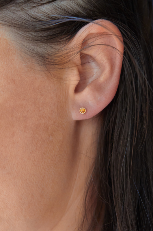 Geelgouden oorknopjes gemaakt in ons eigen atelier, met cognac kleur diamanten. per stuk wegen de diamanten 0,10 crt.
