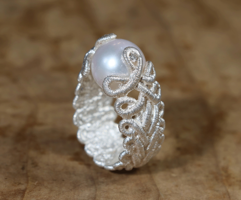 Zilveren ring gemaakt door Brigitte Adolph. De parel is mooi egaal wit in de zilveren lusjes zijn kleine diamantjes gezet in een champange kleur. De maat van de ring is 17, wilt U een andere maat dat kan laat gerust Uw wensen weten info@gold-line.nl