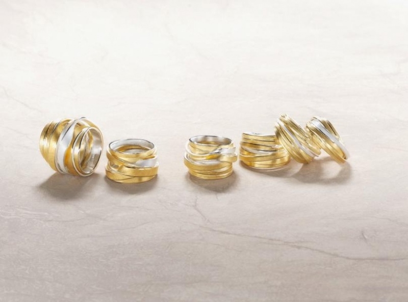 Zilveren ring met diamanten, gemaakt door Ute Strothotte. De ring is gemaakt van een combinatie zilver- en 22 karaat geelgoud en bevat een rij van 21 diamanten. De ring heeft een breedte van 7 mm en heeft maat 18.