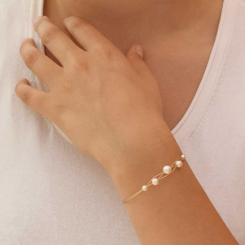 Staal goud vergulde armband met 5 egale witte parels die verschillend zijn van maat. Deze parels blijven tijdens het dragen mooi op hun plek zitten, en de armband kan makkelijk met één hand open en dicht dankzij een klik sluiting. Een elegante armband, die prettig draagt!
