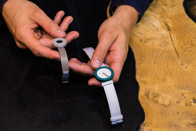 Ontwerp van Lella & Massimo Vignelli, in zwart, zilver of wit – met een kleine diameter en brede kleurringen. 34mm. Dit horloge heeft 3 kleur ring bij de prijs inbegerepen.