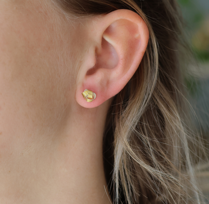Oorknopjes gemaakt door Manu schmuck uit Duitsland. Kleine ruimtelijke knopjes gemaakt van goud op zilver. De grote van de knopjes is 8 mm.