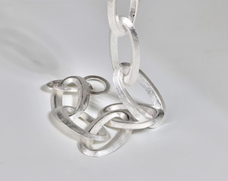 Zilveren ketting, mat bewerkt en gemaakt door Maier en Beck uit Duitsland. De grote ovale schakels zijn licht van gewicht maar door de ruimtelijke uitvoering ogen de schakels zwaar en stevig. Een stoere dagelijks te dragen ketting! De lengte van de ketting is 45 cm.