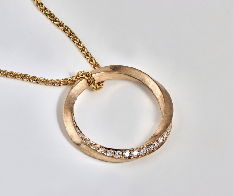 Geel gouden hanger gemaakt in ons eigen atelier. Op een baan van de ring is over de totale lengte vol gezet met diamanten, dus tijdens het dragen kan de hanger draaien en dan zijn er altijd diamanten zichtbaar. De prijs is exclusief de gouden ketting, deze is er bij te bestellen op de lengte naar wens, vraag gerust naar de mogelijkheden info@gold-line.nl