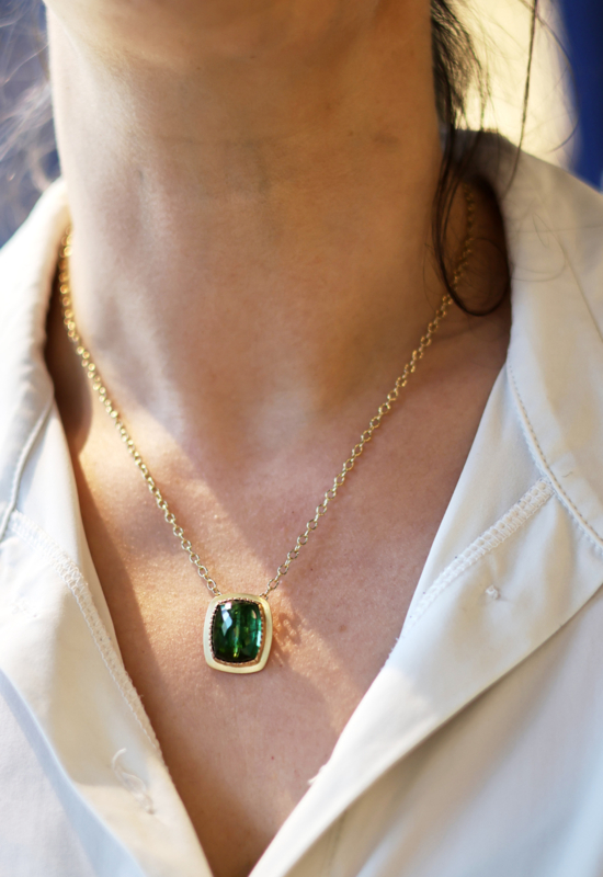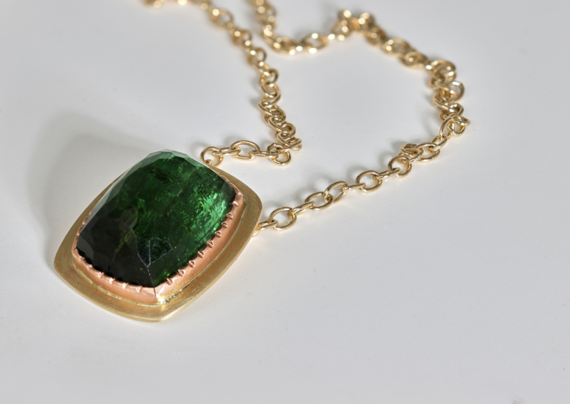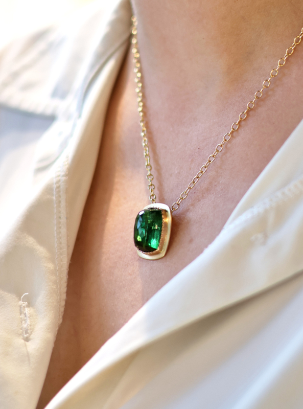 Gouden hanger gemaakt in ons eigen atelier. Deze hanger heeft een groene toermalijn (roos geslepen), de zet rand is rosé goud de rest geelgoud (bicolor). De prijs is inclusief de ketting, deze is 50 cm lang en kan naar wens wens op maat gemaakt worden.
