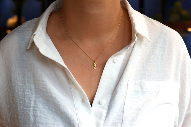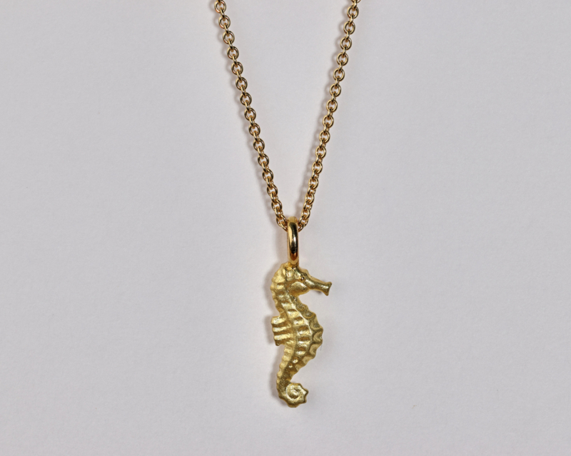Natuurgetrouwe 18 karaat geelgouden zeepaard hanger (15 mm groot zonder hangoog gemeten) gemaakt door Katinka Neuner. Het zeepaardje heeft prachtige mini details. De prijs is exclusief de gouden ketting, wilt u deze er graag bij bestellen laat het ons weten dan bespreken we de mogelijkheden, info@gold-line.nl