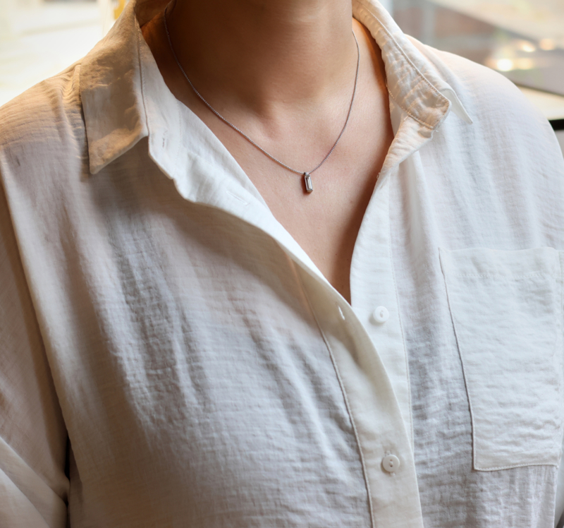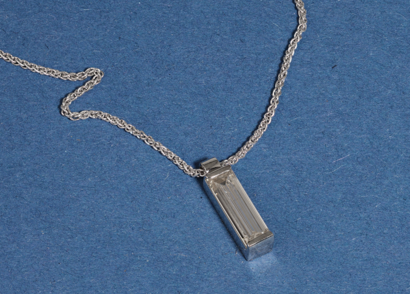 Platina hanger gemaakt in ons eigen atelier. De prachtige natuurlijke diamant (1.03 crt) is baquette geslepen en in een eenvoudige strakke zetkast geplaatst. De prijs is inclusief de ketting van 45 cm.