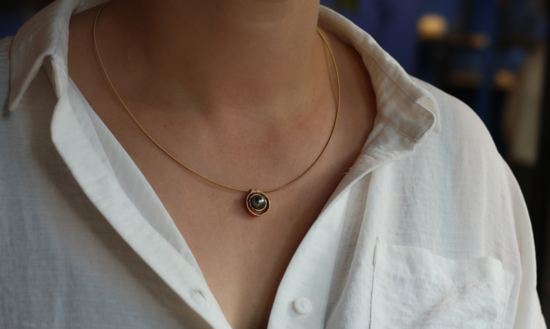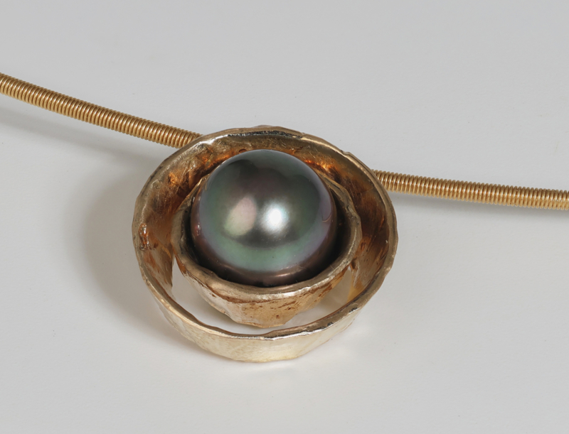 Geelgouden hanger gemaakt in ons eigen atelier. De hanger is uit de dripping art serie en is mat bewerkt. In het midden is een Tahiti parel geplaast. De prijs is exclusief de ketting, wilt u deze erbij bestellen laat het ons gerust weten info@gold-line.nl