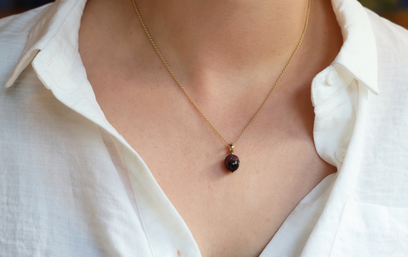 Hanger gemaakt in ons eigen atelier. De hanger is een uniek stuk, met een geel gouden hang oog. De steen is een roodbruine tijgeroog mineraal, die geslepen is in de vorm van een eikel. Super originele hanger, het hang oog kan daaien zodat de eikel steeds zichtbaar is met de verschillende kleur effecten van de tijgeroog. De prijs is exclusief de ketting wilt u deze erbij dat kan, laat het ons gerust weten info@gold-line.nl De hanger is 1,5 cm groot.