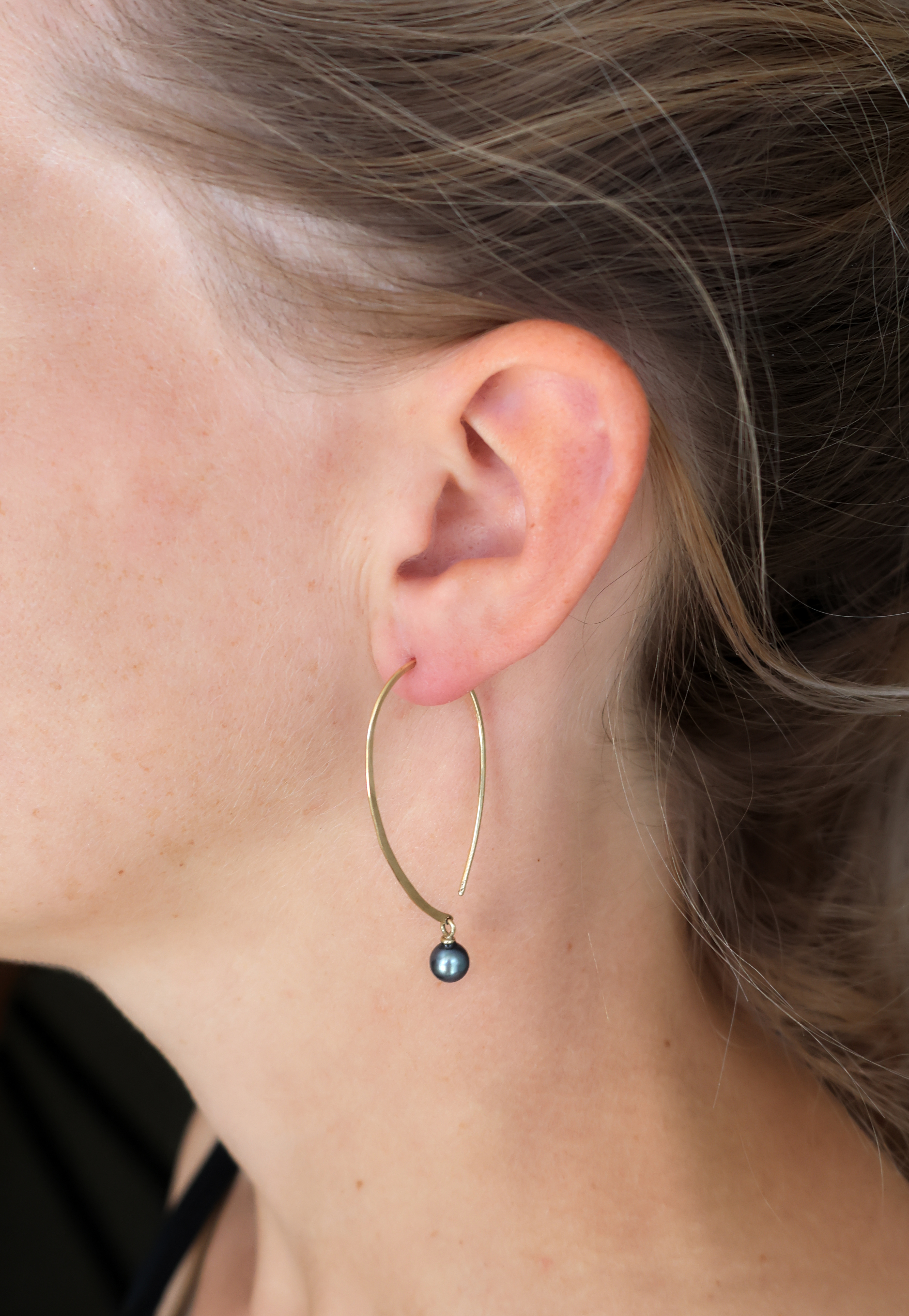 Deze gouden oorbellen zijn gemaakt in ons eigen atlier, een verfijnd model met kleine donkere parels. Dit klassieke gouden ontwerp Het klassieke tevens modern ontwerp is geschikt voor zowel zakelijke als formele gelegenheden. De combinatie van materialen biedt een tijdloze en professionele uitstraling. De oorbellen zijn 5 cm groot.