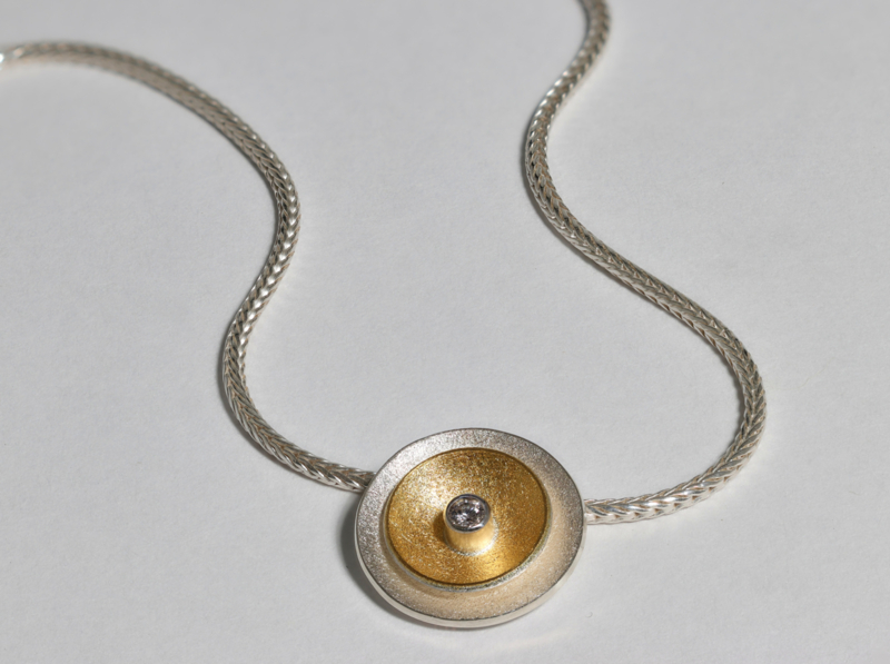 Zilveren ketting met een eenvoudige hanger, gemaakt van goud en diamant door Manu Schmuck. Deze ketting is 45 cm lang en, door zijn eenvoud, geschikt om elke dag te dragen. Het goud geeft een luxe uitstraling, terwijl het diamantje zorgt voor een levendig centraal middelpunt. Het zilveren achterplaatje heeft een diameter van 14 mm.