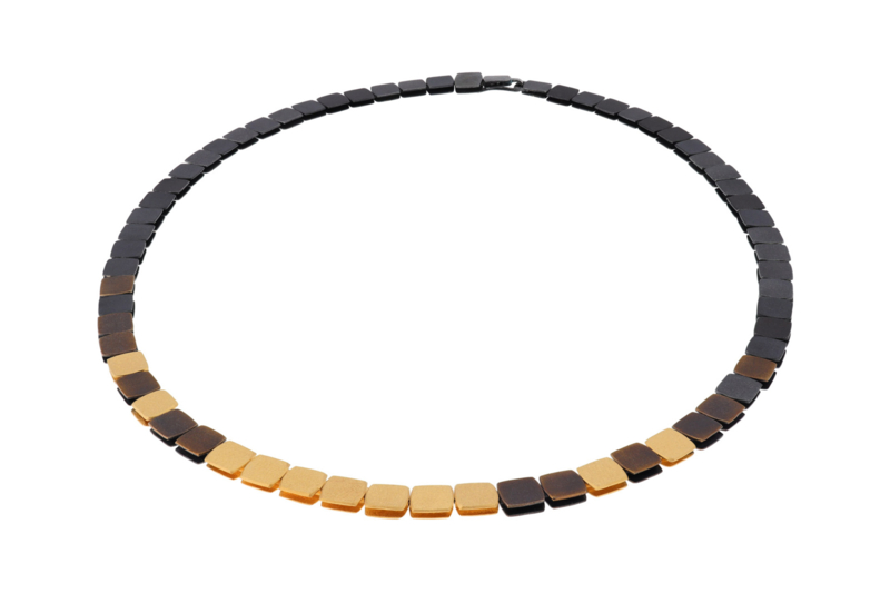 Zilveren collier van Deco Echo uit Polen. De zilveren schakels zijn afwisselend goudverguld en bruin gebeitst. De ketting valt soepel om de hals en is voorzien van een eenvoudige, gemakkelijk te bedienen sluiting aan de achterzijde.