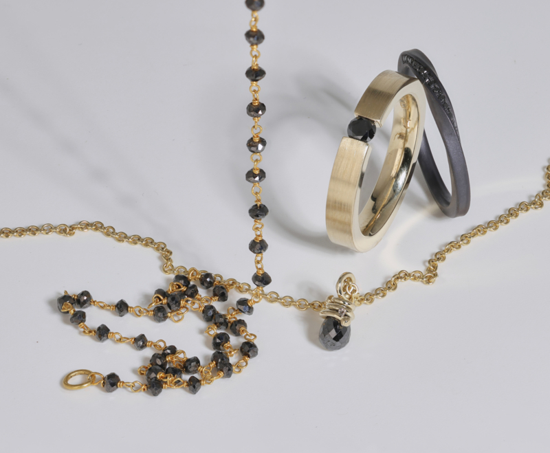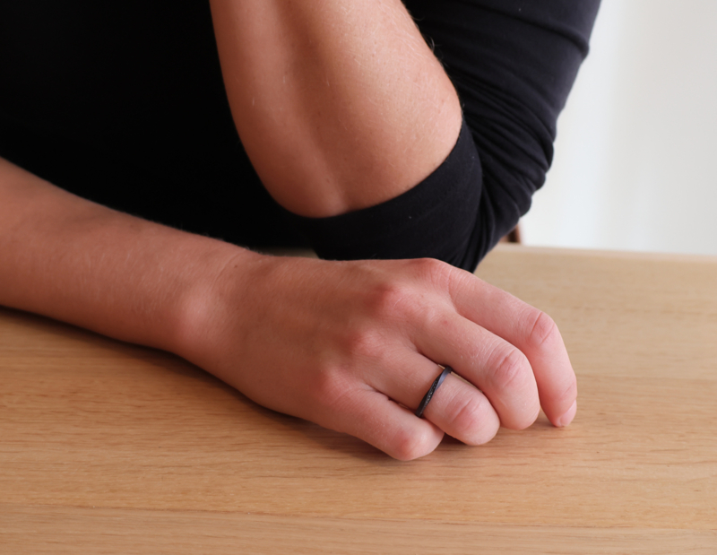Stalen ring zwart gebrand, met in de tors kleine zwarte diamanten gezet. Is gemaakt door Oliver Schmidt.