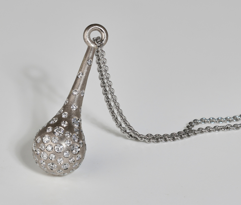 Witgouden druppelvormige hanger, bezet met schitterende diamanten. Deze bijzondere hanger is speciaal ontworpen om een symbolische hoeveelheid as in te kunnen bewaren, maar is ook zonder as een elegant en betekenisvol sieraad.