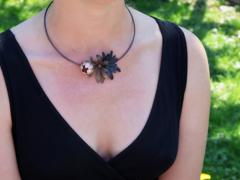 Dit expressieve collier is met zorg vervaardigd door Deco Echo in Polen. De bloemmotieven zijn ruimtelijk vormgegeven, wat het sieraad een bijzondere diepte geeft. Het zilver is op een speciale manier behandeld om een elegante zwarte uitstraling te verkrijgen. De lengte is verstelbaar van 42 tot 45 cm.