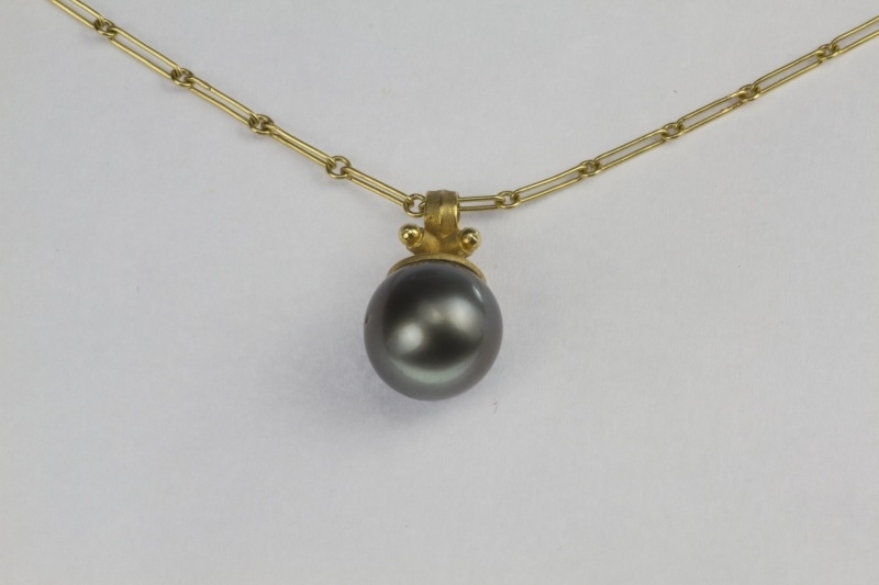 Goldanhänger mit Tahitiperle, hergestellt von Kubik. Der Anhänger besteht aus 18 Karat Gelbgold und enthält eine dunkle Tahitiperle mit einem Durchmesser von 13 mm.