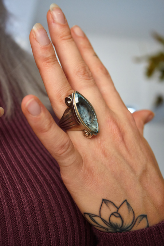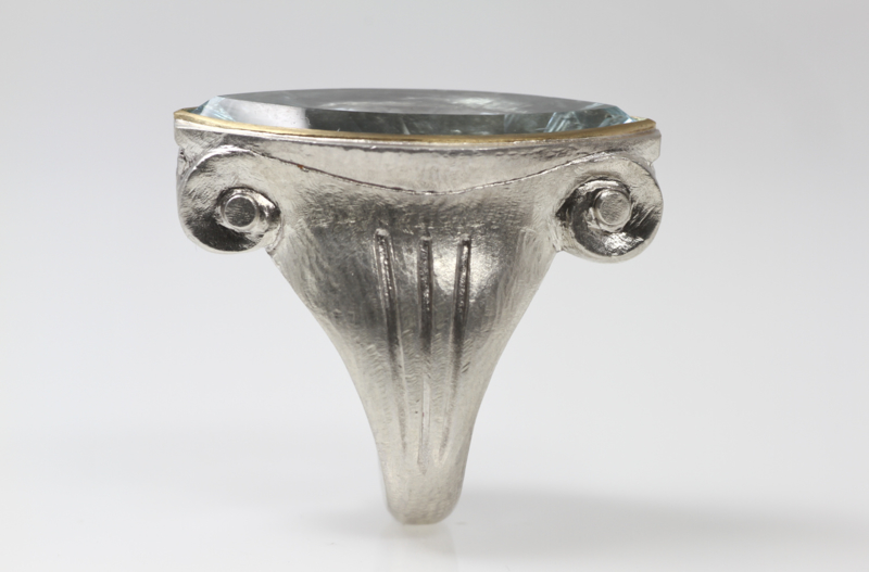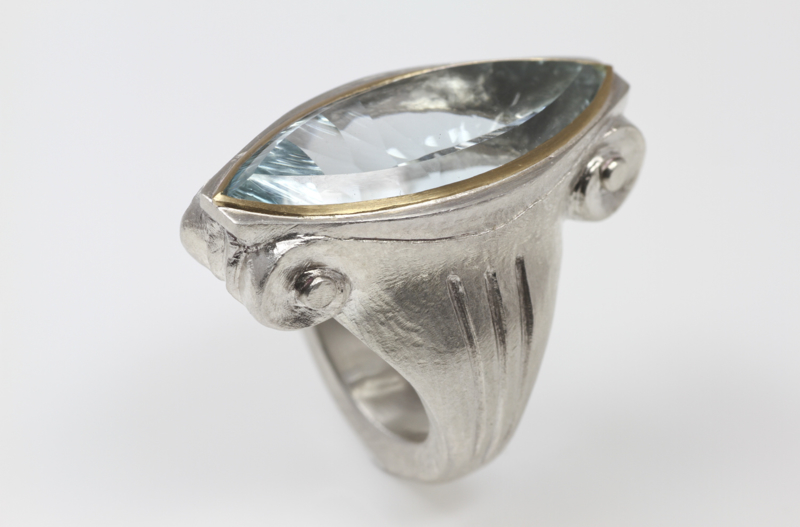 Silberring mit hellblauem Topas, dieser Stein ist ein ganz besonderer Schliff, auch skurril! Der Stein ist in Gelbgold gefasst und der Ring wird in unserer eigenen Werkstatt aus Silber gefertigt. Der Ring ist aus Wachs und in Wachs kann man von dort aus dieses kreative Modell "formen". Der Ring kann in allen Größen geliefert werden, bitte fragen Sie: info@gold-line.nl