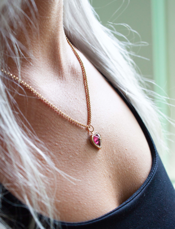 Roségoldanhänger mit Turmalin, hergestellt in unserer eigenen Werkstatt. Dieser romantische Anhänger enthält einen herzförmigen, dunkelrosa Turmalin, umgeben von weißen Diamanten. Diese wiegen zusammen 0,26 crt und sind von reiner Qualität. Der Preis gilt ohne Kette, diese Kette ist ein Jasseron-Glied von 1,8 mm, 45 cm lang und kann hinzugefügt werden, fragen Sie einfach nach den Optionen info@gold-line.nl