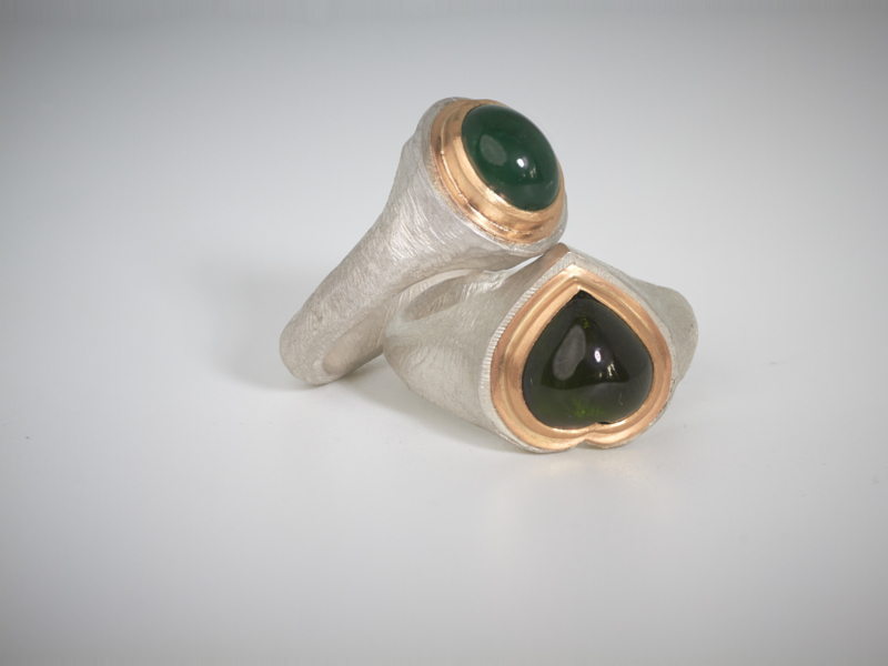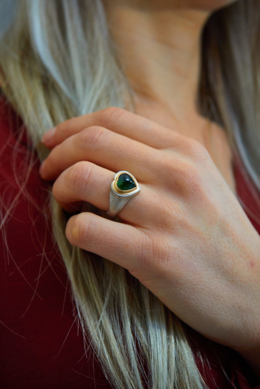 Grob verarbeiteter Silberring, hergestellt in unserer eigenen Werkstatt. Der Stein ist ein Chromdiopsid (dunkelgrün gegen das Schwarz) und ist sehr originell in Herzform geschliffen. Der Ring hat die Größe 54.