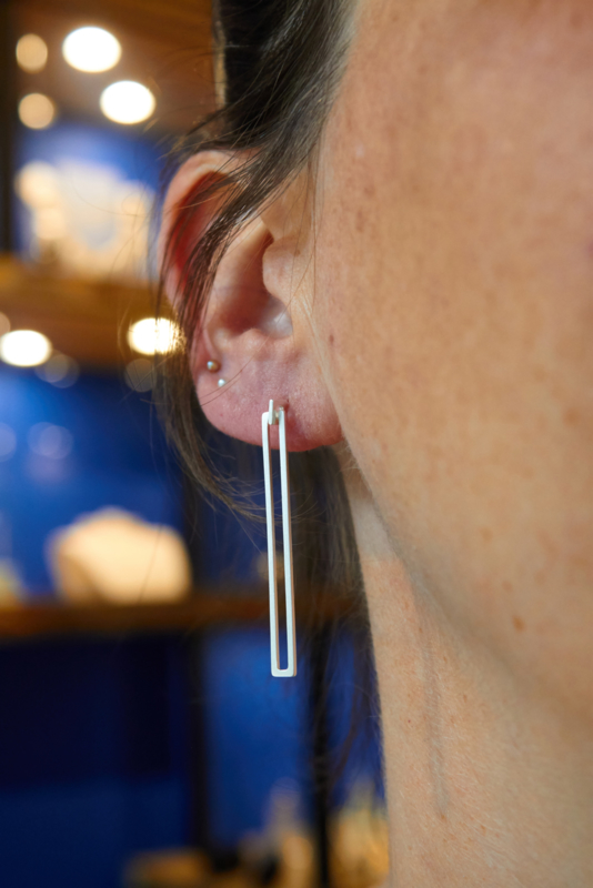 Matt silberne Ohrringe, hergestellt in Polen. Die Steckvorrichtungen sind kleine offene Quadrate, in denen das lange Rechteck frei bewegen kann.