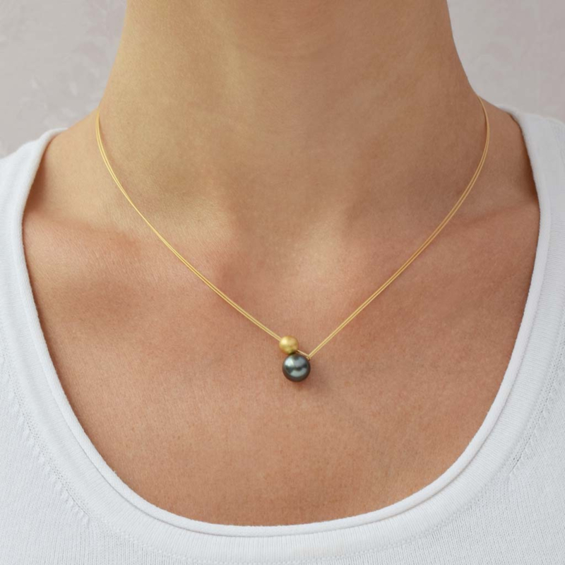 Stahlvergoldete Halskette mit einer Tahiti-Perle mit einem Durchmesser von 9 mm. Die 2. Kugel ist aus versilbert/vergoldet, die auch der Verschluss ist, mit dem die Kette an- und abgenommen werden kann. Eine Halskette, die sich sowohl mit farbiger als auch mit schwarzer Kleidung perfekt kombinieren lässt.