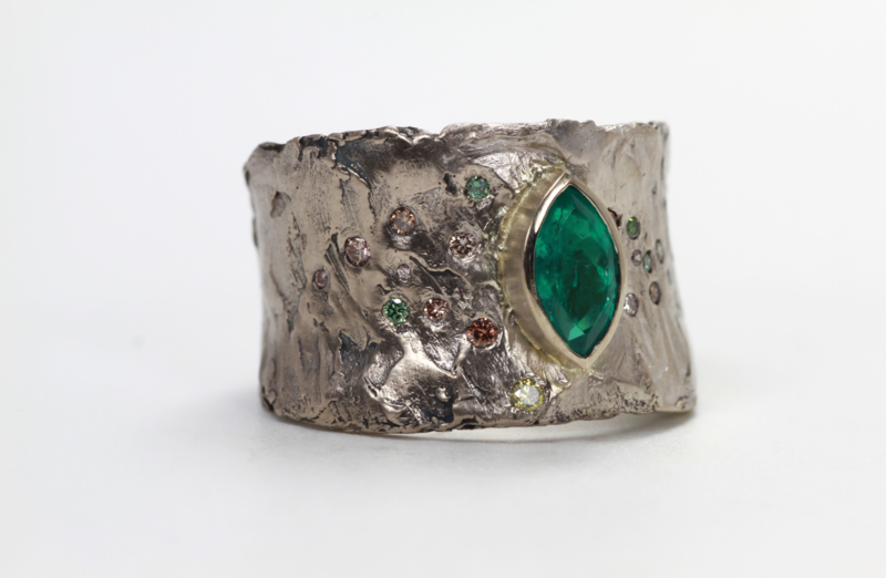White gold ring from the tree bark series made in our own workshop. A rough and matte finished ring with a navette cut emerald in the center, on the side are small colored diamonds. A cool and pleasant ring to wear every day!