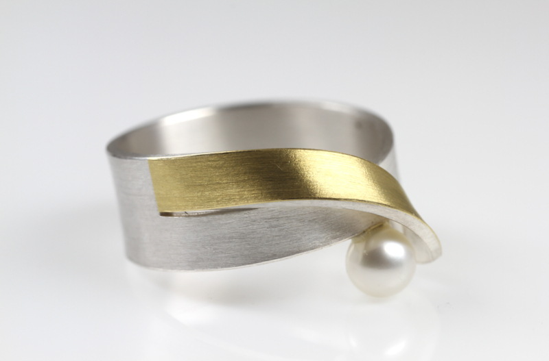 Silver ring with 22 carat gold, designed and made by Manu Schmuck from Germany. The ring features a white pearl that is elegantly embraced by a delicate gold loop. The ring in the photo has size 18; unfortunately, it is not available in other sizes.